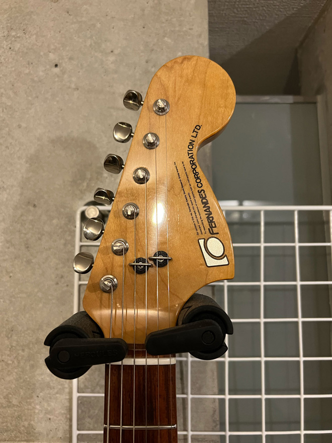 製造年はおそらく1978年から1980年あたりと思われます。当時のカタログスペックから、ボディ材はセン(アッシュの代用材)、ネックはメイプル、フィンガーボードはローズウッドのようです。ピックアップはフェルナンデスのオリジナルモデルです。