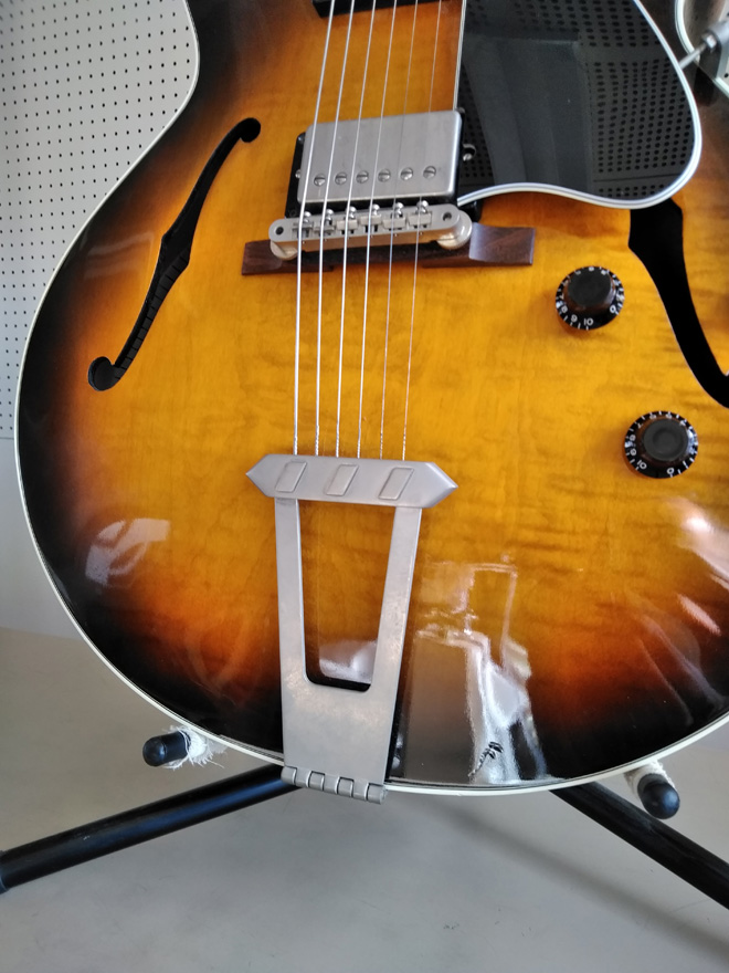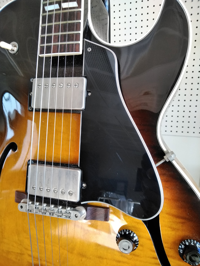 1995年初頭、ふらっと一人で東京へ行きました。目的の一つはジャズのライブ、もう一つは憧れのフルアコのギターを買うこと。そしたら、このギターの新品が、地元大阪ではありえない安値で売られていました。試奏して何の問題もないことを確認→大阪に帰って同等の値段のものがないことを確認→東京の楽器屋に電話注文、現金書留で送金