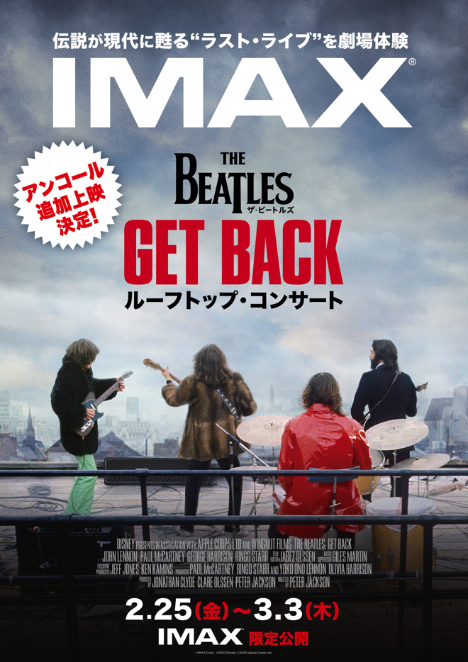『ザ・ビートルズ Get Back: ルーフトップ・コンサート』のアンコール追加上映が決定した。2月25日から3月3日まで、全国39のIMAXシアターで上映される。