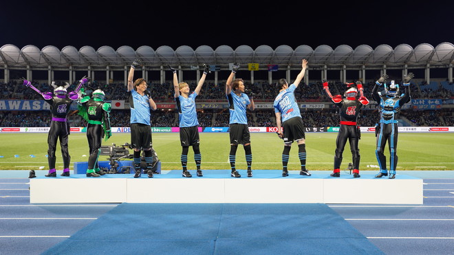 すると映画『スーパー戦闘 純烈ジャー』の純烈ジャーが「フロンターレの大事な26(ふろ)周年を汚す悪者よ!俺たちがそうはさせない!」と登場。華麗な立ち回りのザ・ヒーローショーが展開された。