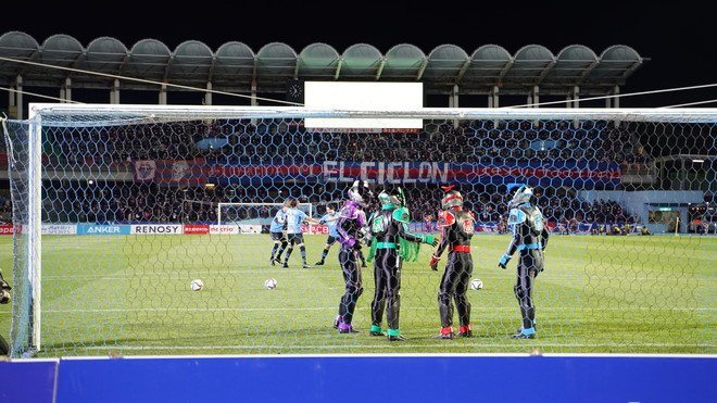 そしてペナルティスポットに移動し、高校サッカー選手権で山口県代表・高川学園が行って話題となった“グルグルFK”を模してサッカーファンを喜ばせた。ただ、シュートしたのはひとりではなく、“史上初の複数人シューター”として純烈メンバー4人全員が同時にシュート。ゴールキーパーは純烈が変身した後の姿である純烈ジャーが務めるなど、史上初ダラケの始球式となった。
