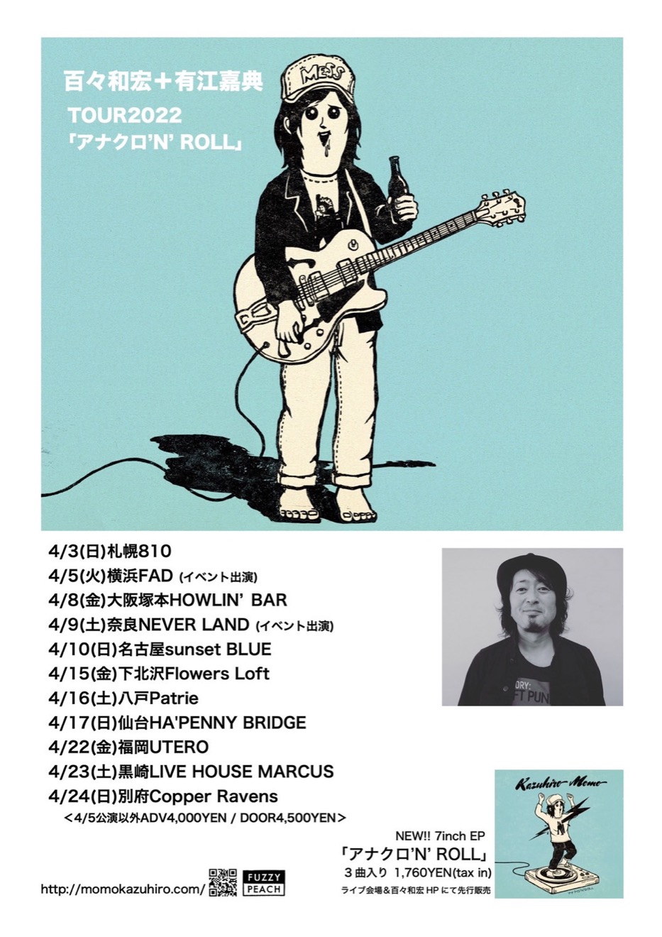また、百々は4月3日(日)にアナログ7インチ3曲入りEP「アナクロ’N’ ROLL」を自身のレーベルFUZZYPEACHよりリリース。同日よりベーシストの有江嘉典とデュオ編成で全国11ヶ所をまわるツアーもスタートする。「アナクロ’N’ ROLL」はライブ会場と百々和宏オフィシャルサイトの通販より販売となる。