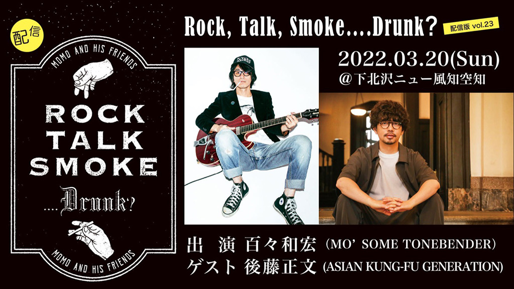 MO’SOME TONEBENDERの百々和宏(Vo&G)が主催する定例トーク&ライヴ・イベント<Rock, Talk, Smoke….Drunk?>の3月開催ゲストに、ASIAN KUNG-FU GENERATIONの後藤正文(Vo&G)の出演が決定した。