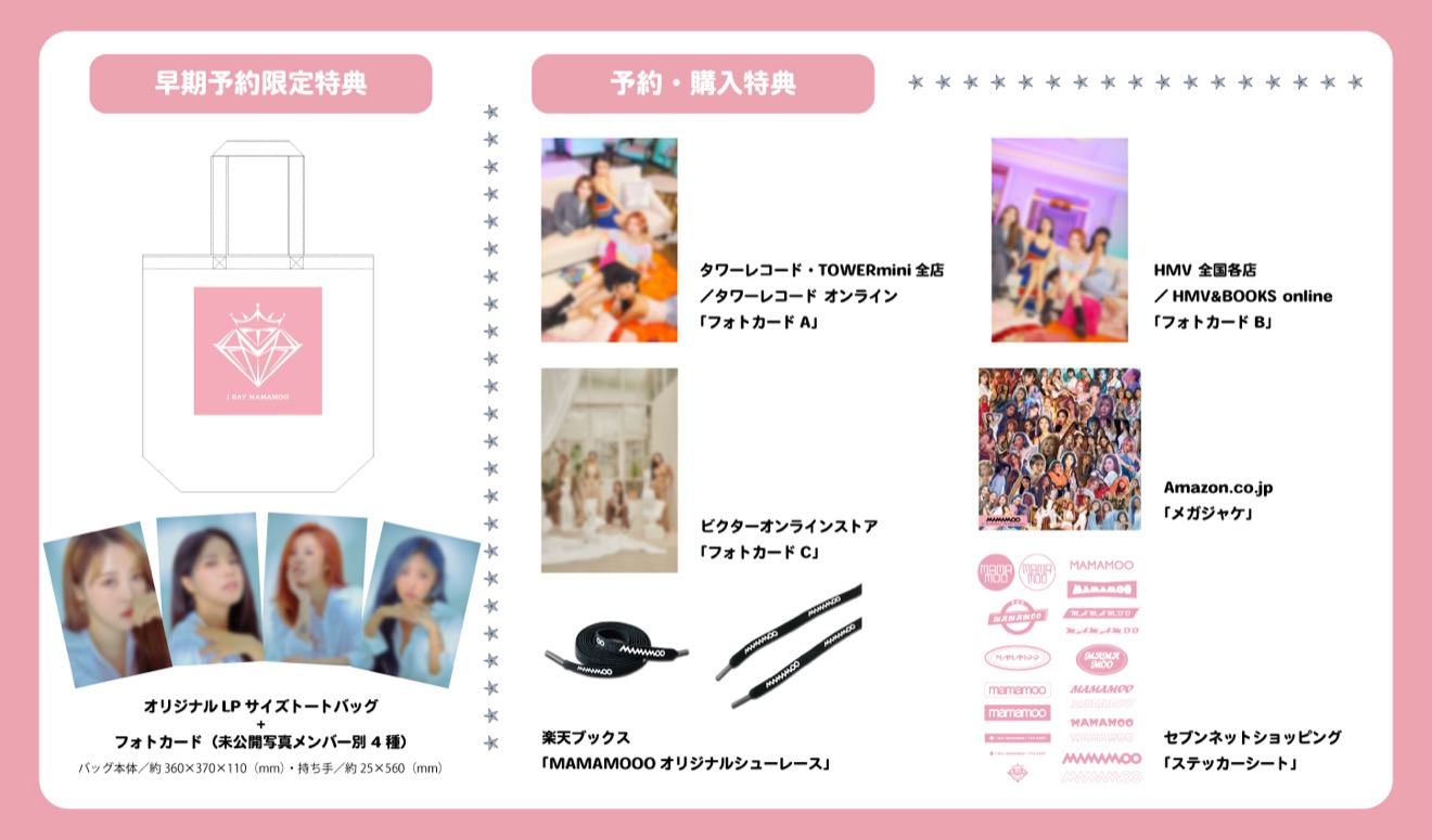 下記対象店・オンラインサイトにて、対象期間内に初回限定盤をご予約の方には、早期予約限定特典「オリジナルLPサイズトートバッグ+フォトカード(メンバー別4種)」をプレゼントいたします。お店毎に商品の数に限りがございますので、規定数に達し次第終了となります。通常盤は対象外となります。
