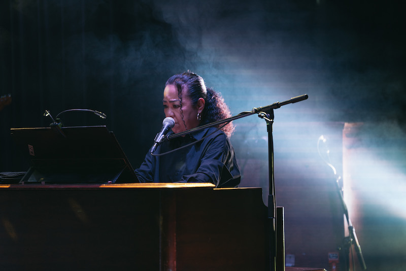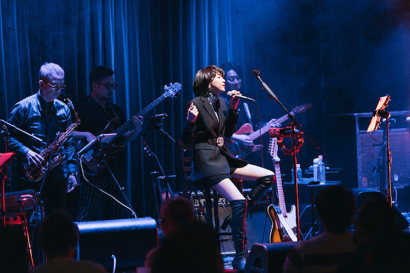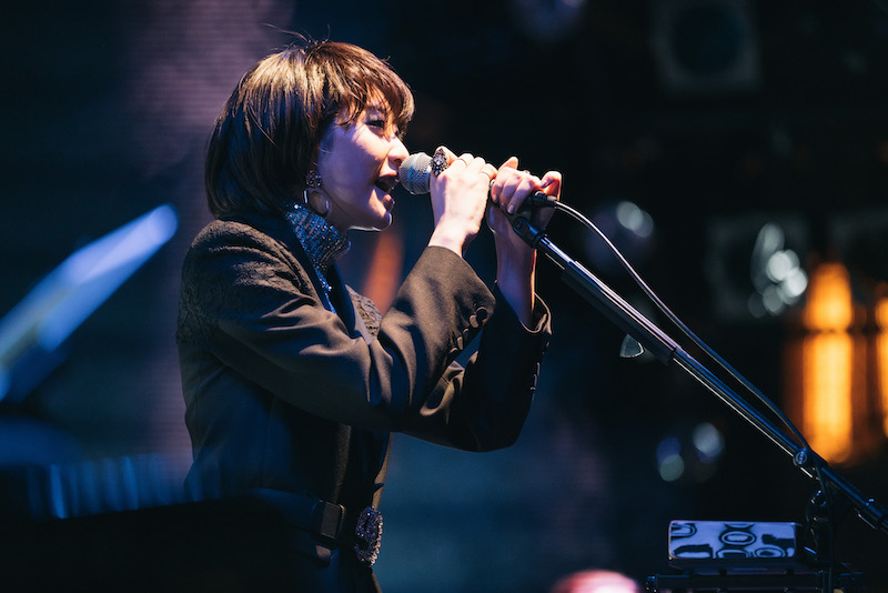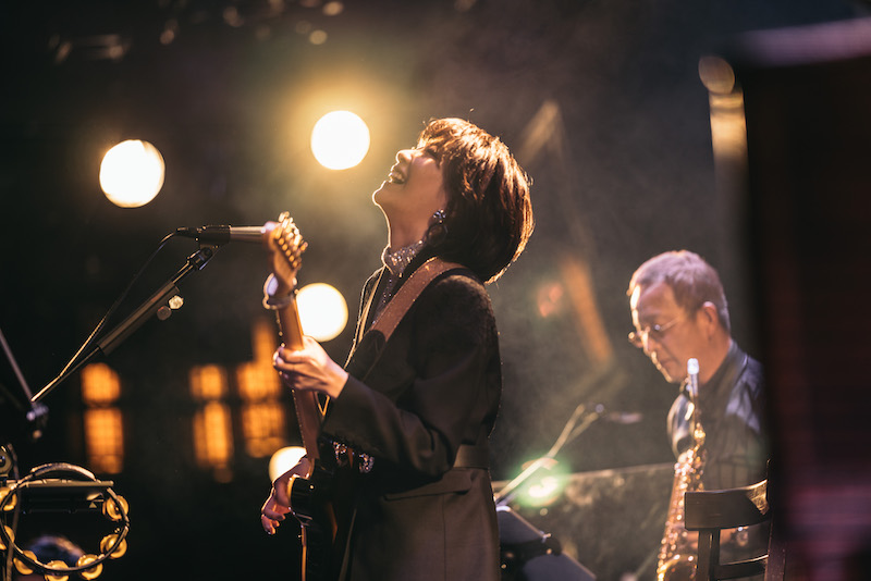 「だから、みなさんと作っているライブです。ほとんど知ってる曲ですからね、心の中でぜひいっしょに歌ってください」——そう言って演奏されたのは、寺尾聰の「ルビーの指環」と稲垣潤一の「ドラマティック・レイン」。いずれもロマンティックな詞の世界観が際立つ80年代の名曲で、今度は哀愁たっぷりのストーリーに浸らせてくれる。その音域の広さや歌唱力の高さで男性シンガーの渋みも表現できるあたり、本当にレパートリーが豊富。何より、彼女自身がシティポップで彩ったステージを心底楽しんでいる感じがとてもいい。直後のMCでも「ルビーの指環」を編曲した井上鑑が大好きと語り、お気に入りの曲として稲垣潤一「夏のクラクション」、大瀧詠一「幸せな結末」、小泉今日子「木枯しに抱かれて」を挙げたり。松本隆の作詞活動50周年記念イベント<風街オデッセイ2021>に足を運んだときの話で、同ライブに出演した山木と佐々木とともに盛り上がったりと、あふれんばかりの歌謡曲愛に、観る側も思わず頬が緩む。