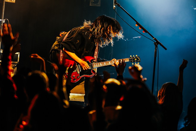 後半戦に入っていくと、ライブ前にプレゼントされたサングラスを全員で身に付け、the telephonesのカバー曲「Love&DISCO」を披露するサプライズ演出が。途中でカナタタケヒロ(Vo&G)から「やっぱりこの人と歌いたいわ!」と呼び込みがあると、石毛 輝(VOX/GUITAR/SYNTHESIZER)が登場し、一緒にステージで熱唱した。