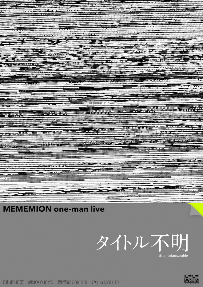 また、4月24日に渋谷・TOKIO TOKYO にて、<MEMEMION one-man Live「タイトル不明」>が開催されることも発表された。MEMEMION初のワンマンライブとなるこの公演チケットの発売は、3月1日12時からとなっている。