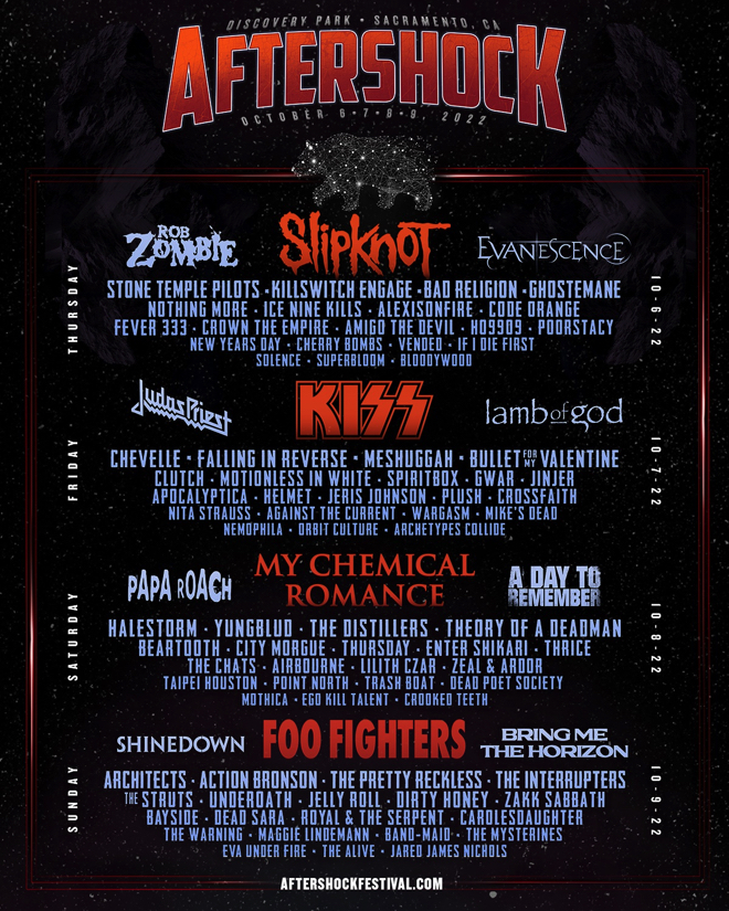 10周年を迎える<Aftershock Festival>は10月6日から9日までの4日間、Discovery Parkにて開催。KISS、フー・ファイターズ、スリップノット、マイ・ケミカル・ロマンス、ロブ・ゾンビ、ジューダス・プリースト、パパ・ローチ、シャインダウン、エヴァネッセンス、ラム・オブ・ゴッド、ア・デイ・トゥ・リメンバー、ブリング・ミー・ザ・ホライズンらが出演する。