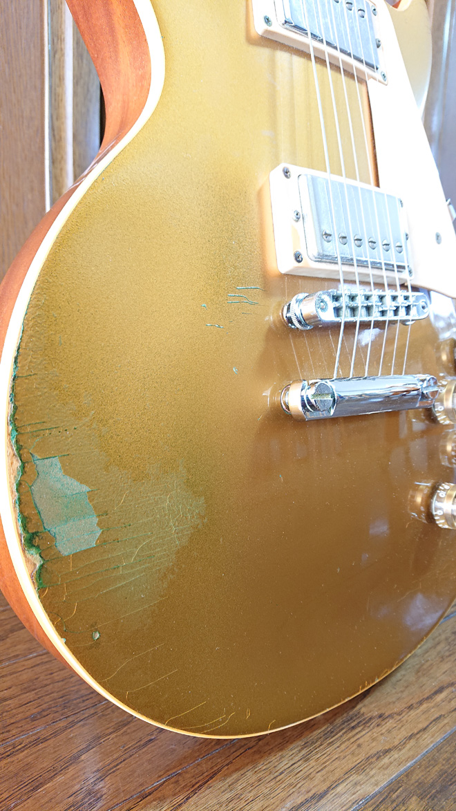 右腕が当たる部分、めっちゃカッコいいクラックとウェザーチェックが入っているやん。緑青も吹いて、最高にイケメンなゴールドトップになったってやつ。もうね、ここだけでどんぶり飯2杯食えるんですけど、私、変態でしょうか。あと20年弾き続けたら、気絶モノのルックスになることでしょう。楽しみすぎる。(JMN統括編集長 烏丸)