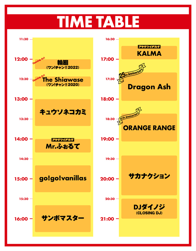 ORANGE RANGE、キュウソネコカミ、go!go!vanillas、サカナクション、サンボマスター、Dragon Ash