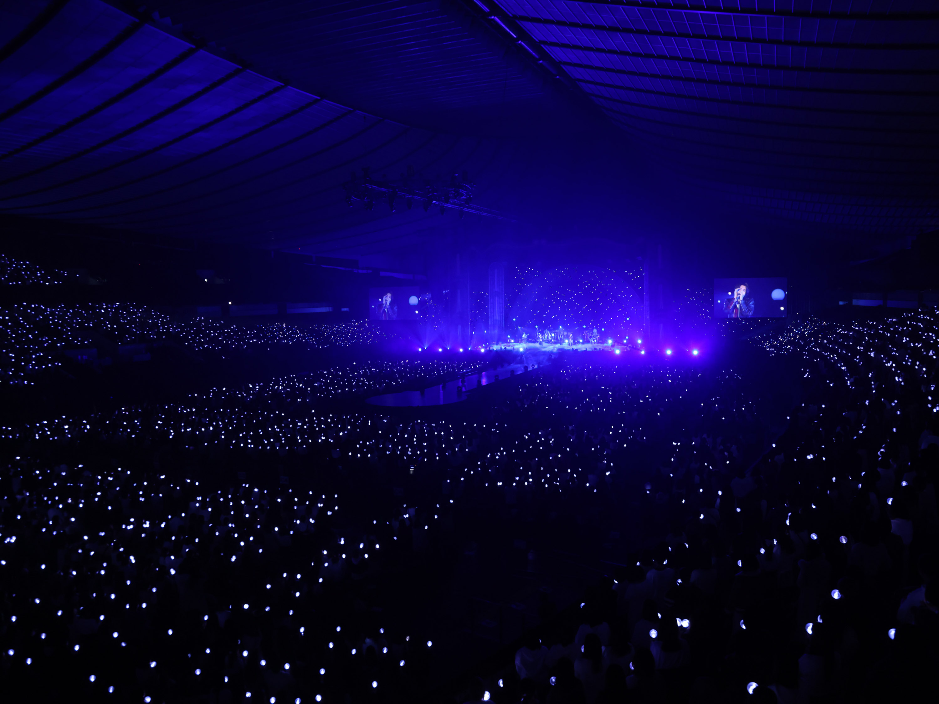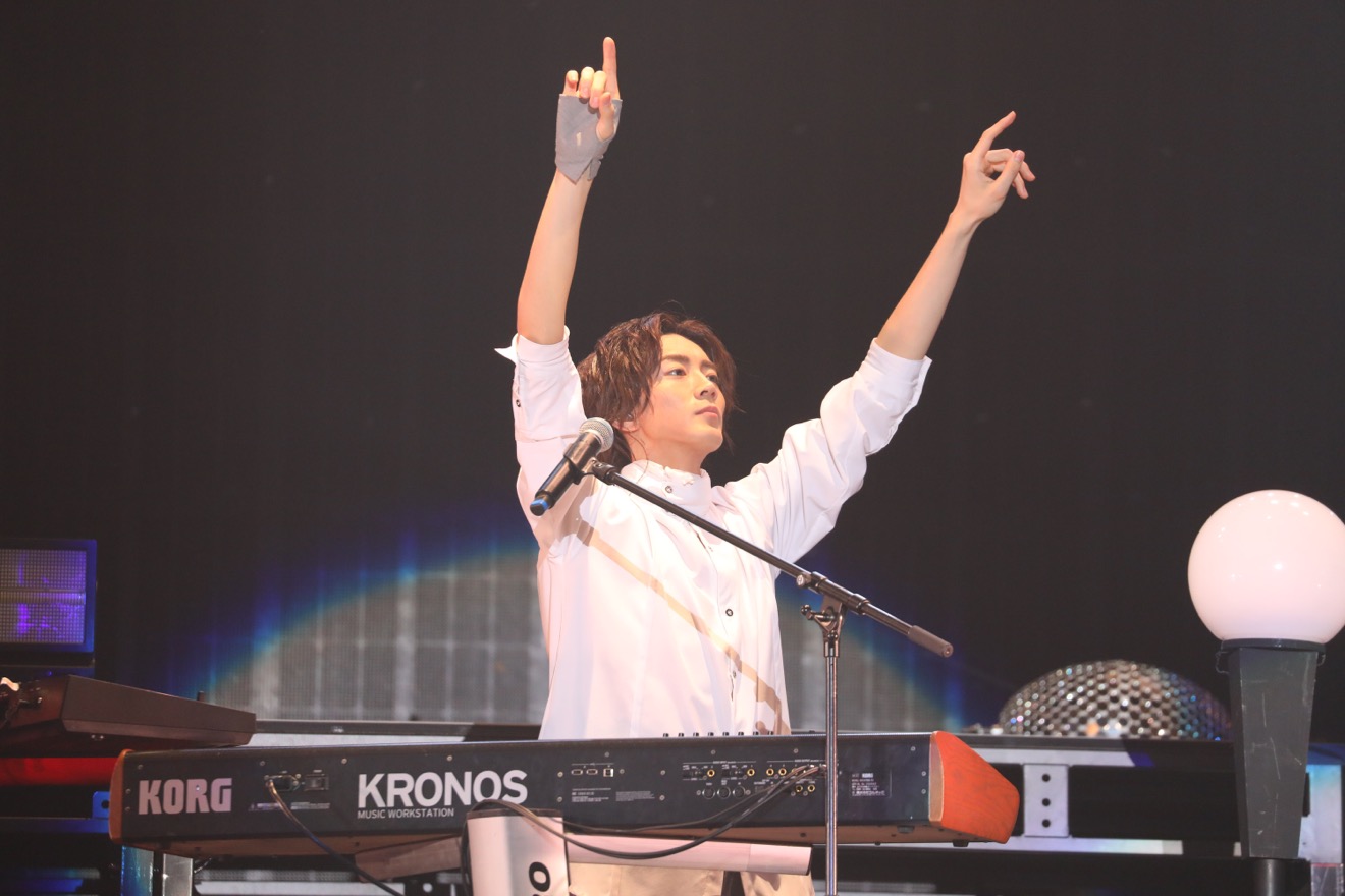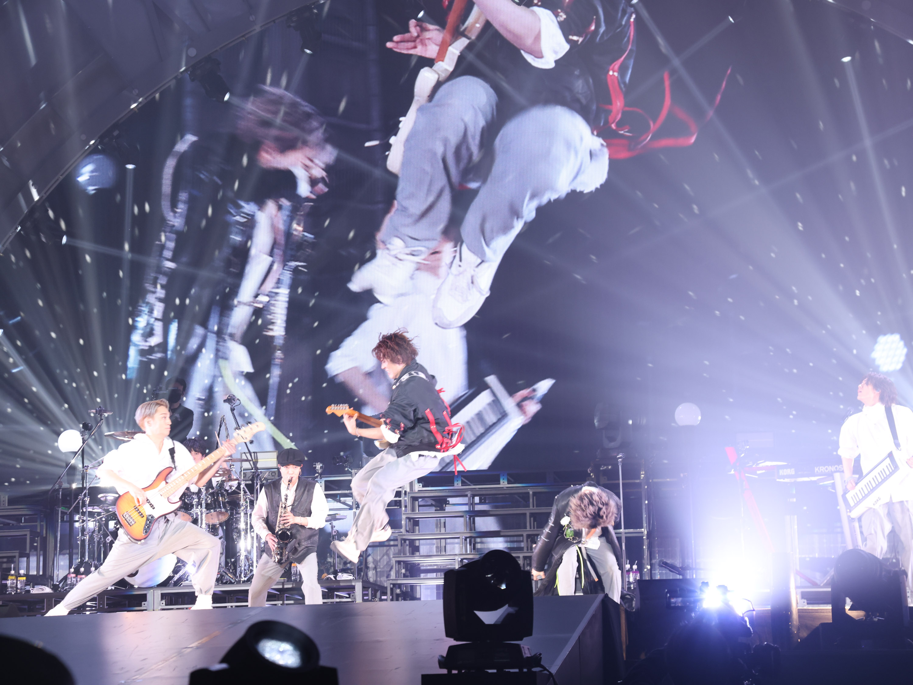 そうして「そんな話をしていたら星空がみえる時間になってきましたね」というと、その言葉を合図に、観客はペンライトの色を一斉に白にして、場内に美しい星空を作って見せた。その星空を見ながら、森田がエモーショナルな歌声で“ぼんやりと長い夢を見ていたような気がしていた”と「夢想人」を歌い出す。2番からバンドが加わり、終盤に向けてサウンドとともにどんどん力強い意思をのせて“嘲笑えよ 無謀な冒険さ 諦めない 心は持ったから 行けよ 夢見るdreamerよ”と歌い放ったところから “未完成の理想 掲げる「僕ら 独りじゃない」”と投げかける「agitate」へつなぐ。溢れ出す強烈な言霊の数々。彼らだからこそ説得力を持って届く体当りのメッセージに、胸の奥から熱いものがこみ上げてくる。観客はそれを余さずキャッチするように、ペンライトをかざす。