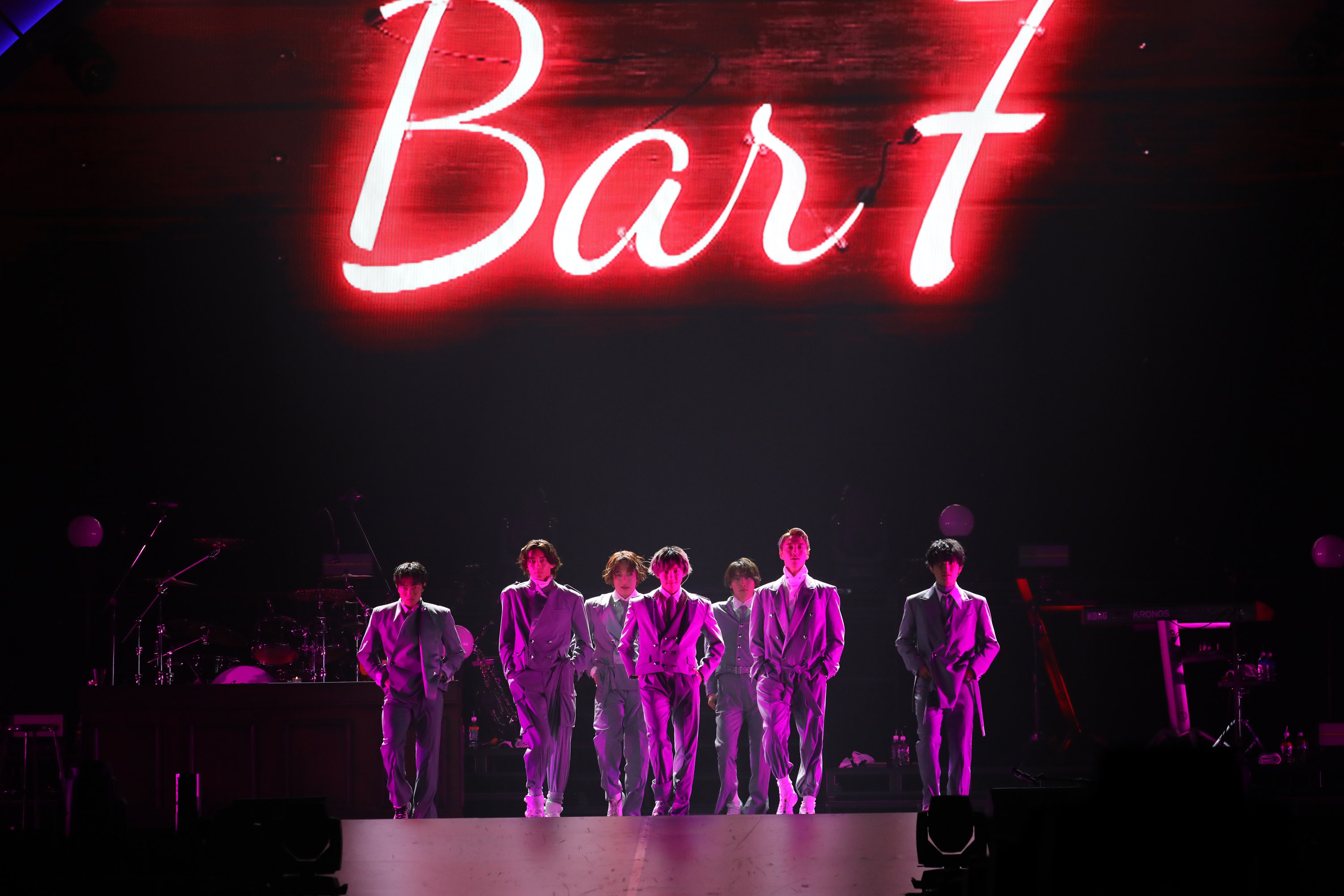 そうこうしているうちにだんだんと日も暮れ、ステージ上には「Bar7」がオープン。スーツに着替えたメンバーが出てきて、ソウルミュージックに合わせてグルーヴィーに身体をくねらすと、場内はたちまち夜の大人のムードに包まれる。そうして、始まったのは阿部と長妻のユニット曲「カシス」。ここでは最初に安井、諸星、森田が、後半は真田、萩谷も加わり、5人が立ち位置を変えながら2人のバックダンサーに徹するというアクティングで、客席を沸かせていった。そのあとは「Make it true」〜「What you got」〜「&Y」といった楽曲群をシームレスにつないだDJ MIXに合わせて、メンバーたちが順番にソロダンス、ラップを披露。
