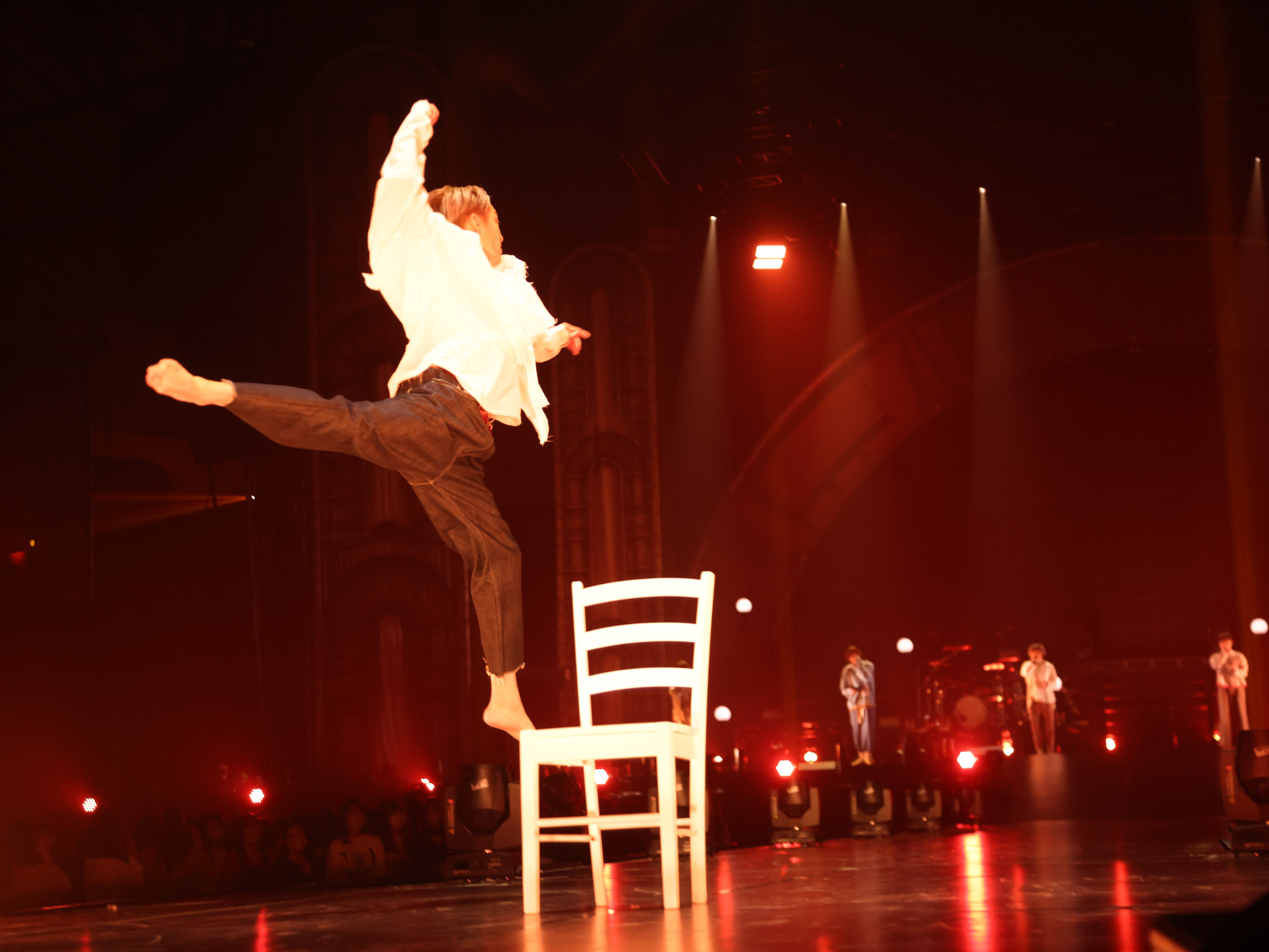 萩谷がキーボードに移動して「蛍の光」を弾いて、「Cafe7」の営業が終了したあとは安井が「ペンライトを消して僕らの歌を聴いてもらえますか」と客席に語りかけ「Rest of my life」へ。メインステージではメンバーが1人、また1人と加わり、声を重ねながら美しいハーモニーを構成。歌で観客を魅了していく。花道の先端にあるセンターステージに真っ白いシャツに着替え、裸足で現れた森田は、ダイナミックに身体全体を使いながらも、指先まで神経を研ぎ澄ました繊細な動き、表情の変化で歌詞を細やかに表現する渾身のソロダンスで観客を圧倒。そうして、最後にメインステージで6人が1列に並んで“また歩き出せばいい”と歌うところで、森田が客席に背中を向け、花道を踊りながら6人がいるステージに近づいていくエンディングはあまりにもドラマチックで、心が震えた。そうして、この雰囲気のままバラード「もしも」をゆっくりと回転しながらリフトアップしていくセンターステージで、しっとりと歌い上げた7人。そのあと「Feel So Good」が始まると、思いっきり自由に弾けだすメンバーたち。ここではそんなメンバーたちを、ステージに上がった映像チームのカメラマンが必死で追いかけまくり、彼らのわちゃわちゃシーンをとらえてビジョンに映し出して観客を笑顔にしていった。