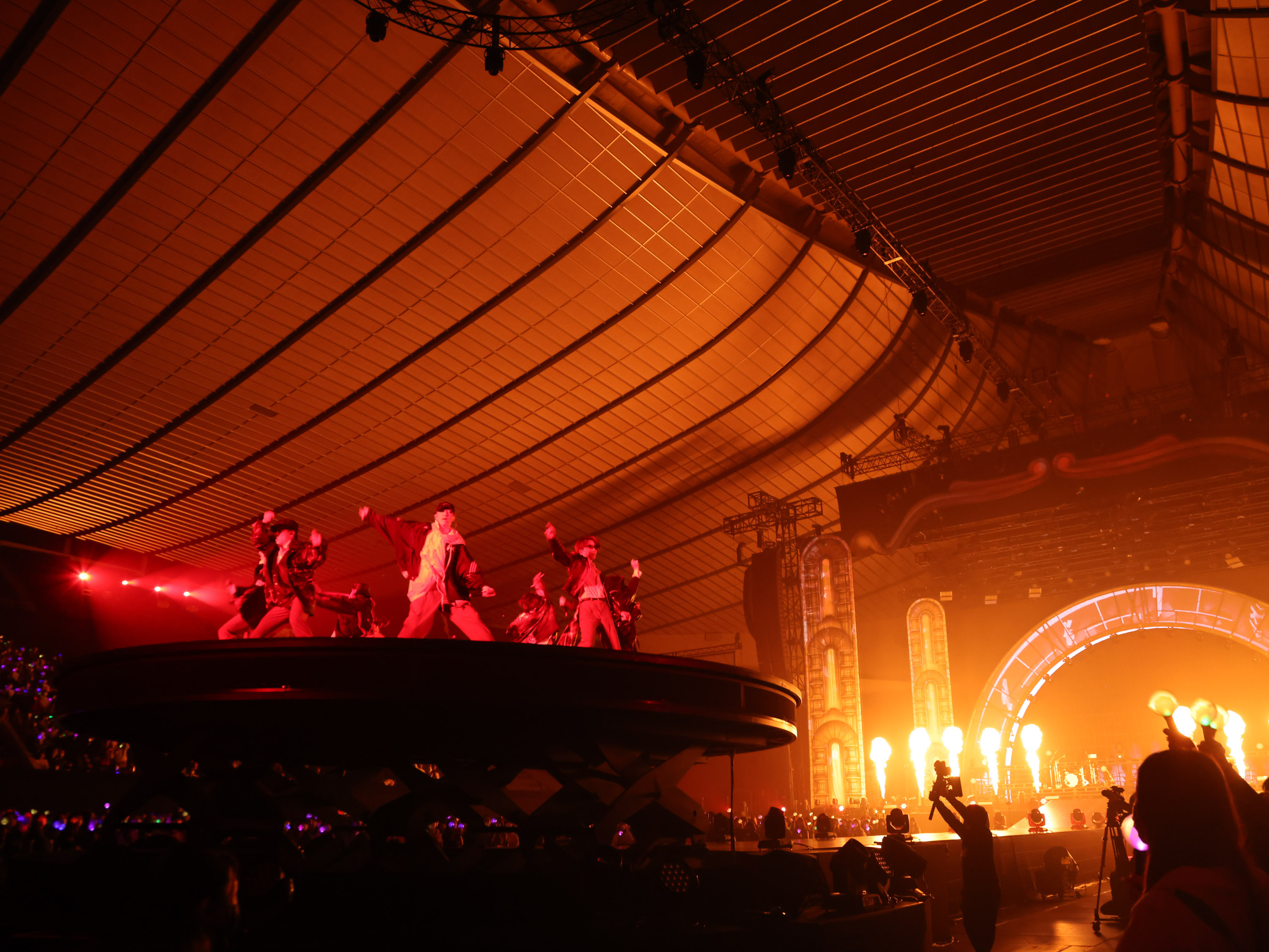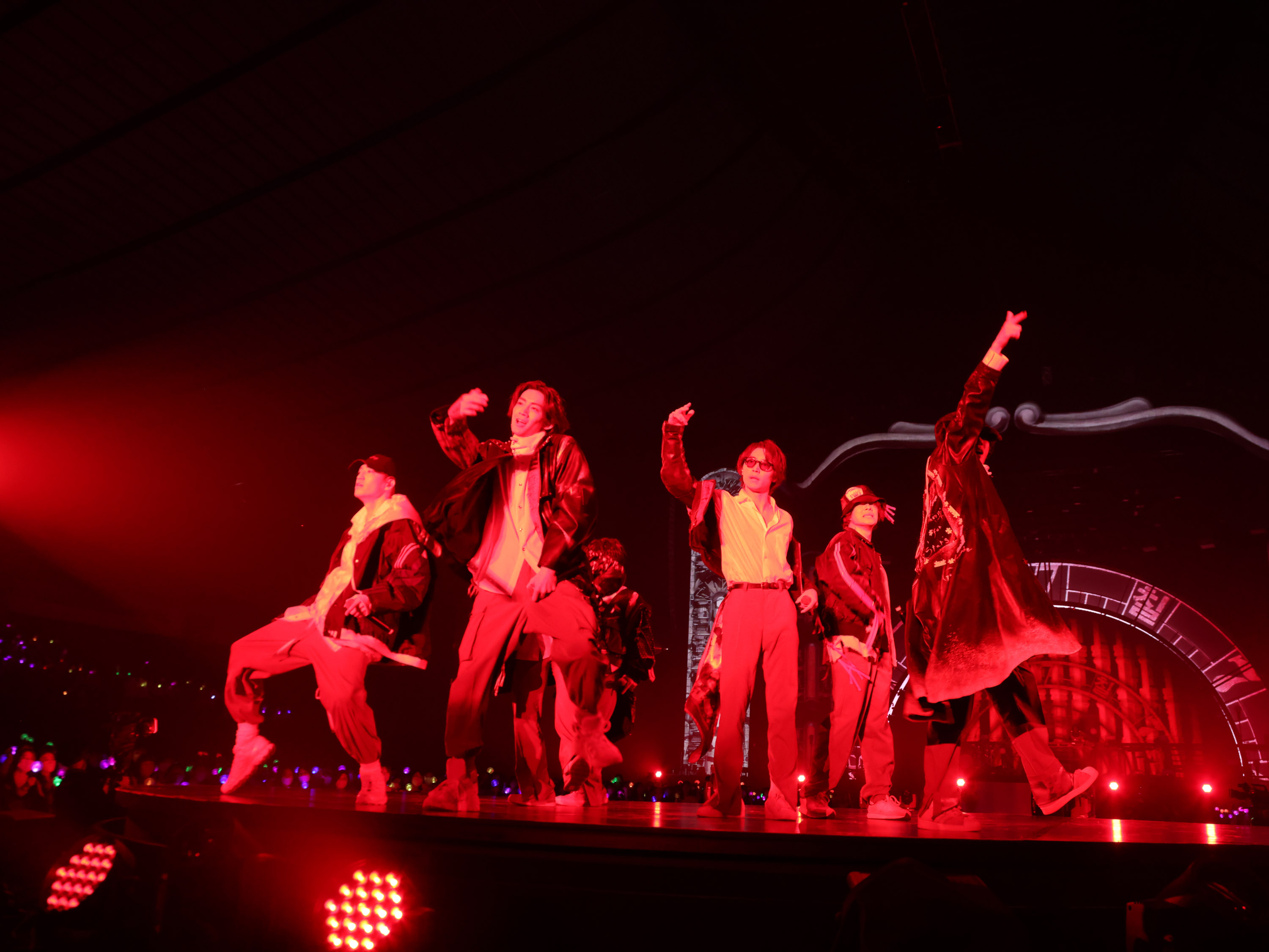 そうして場内が暗転すると、ビジョンにはハリウッド映画を思わせるようなCGを使った映像が映し出され、そのなかにいるモンスターが代々木の屋根を覗き込むと、ステージでは炎や白煙が天井めがけて勢いよく吹き上がる。そのあと、センターステージに集結したメンバーが歌い出したのは「MONSTER」だった。赤いライテンィング、火柱がたち登る上がるなか、挑発的な表情を浮かべて難易度の高いダンスをガシガシ激しく踊りまくるメンバーたちは、めちゃくちゃカッコいい。最後、爆発音が場内に響き、MONSTERが消え去ったあとは、安井がここまで33公演を走りきれたのは「あなた」のお陰だとファンに感謝の気持ちを届け「僕たち7人が突き進むことが誰かの背中をちょっぴり押せたり、誰かの勇気になることを信じて、今後も突っ走っていくので応援よろしくお願いします」といって頭を下げた。