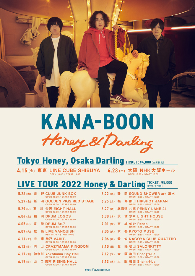 このツアーは、3月30日にリリースするニューアルバム『Honey & Darling』を引っ提げ、4月に東京と大阪にて開催のホールワンマンライブ<KANA-BOON presents「Honey & Darling」-Tokyo Honey, Osaka Darling->に続いて全国19都市にて全20公演行われる。