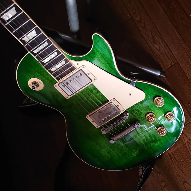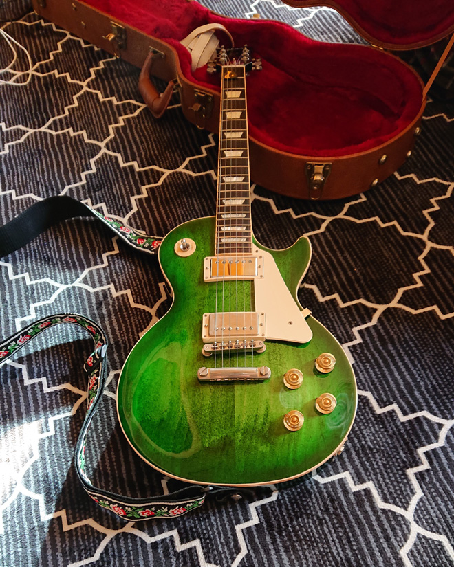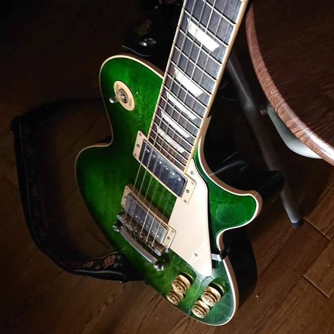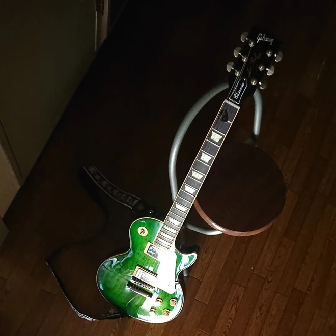 2017年に新品で購入したギターですが、当時『人と違った色のLES PAULを…』と思って本やネットを見ていたらインパクトが強いコイツ(緑)を見付けて、楽器屋へ行って『緑のLES PAULありますか?』と尋ねたら「ありますヨ!」で即決でした。