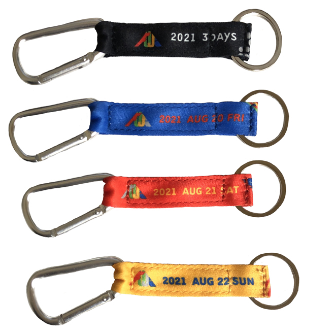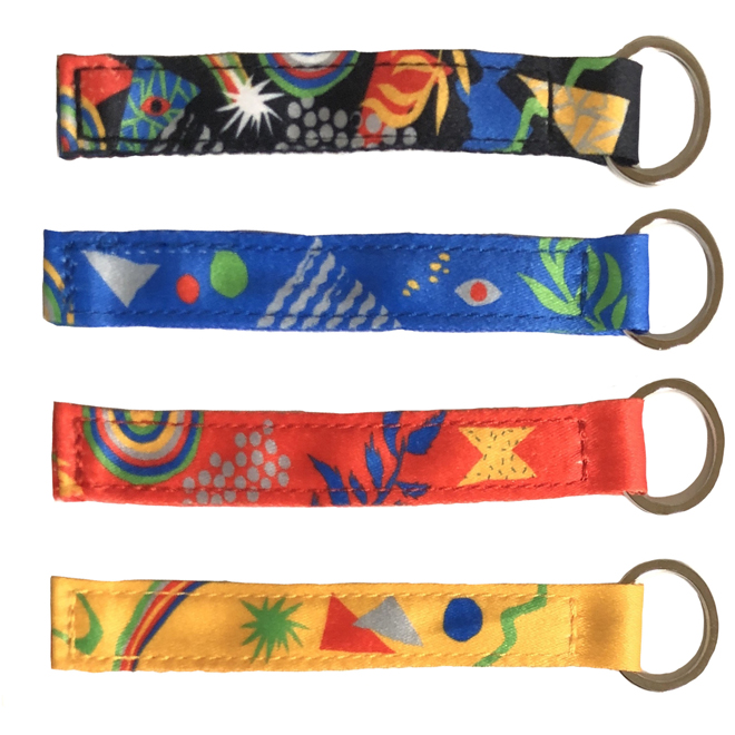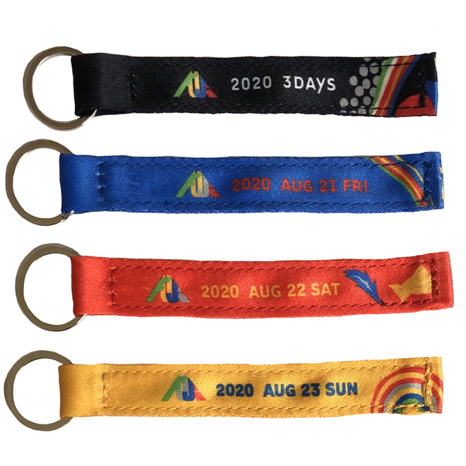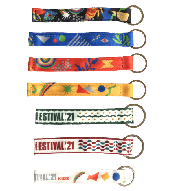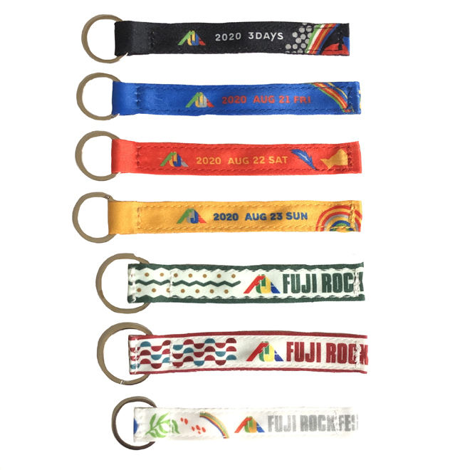 人気アイテムのひとつ、過去のリストバンドをリサイクルしたリストバンドキーホルダー。