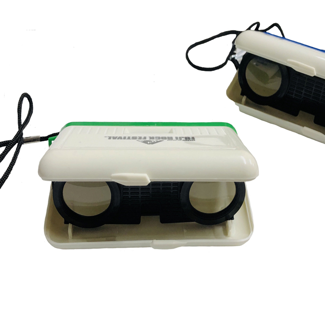 倍率3倍、薄型サイズの双眼鏡。折りたたみ式で持ち運びにはかさばらず、野外ライブやアウトドアにもってこい。紐は、首から下げられる長さと、手首からぶら下げられる長さの2種類セット。マスクなどちょっとした小物を入れられる袋付きです。