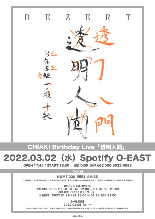 かくして、千秋の誕生であり、今年初のライヴにして、シングル『再教育』の発売を控えた中での本公演<CHIAKI Birthday Live「透明人間」>は、もちろんDEZERTにとって良い景気づけになったはず。3月29日の渋谷CLUB QUATTRO公演から始まる<DEZERT LIVE TOUR 2022 “再教育ツアー”>と、6月18日に決定しているDEZERTにとって初の日比谷野外大音楽堂ライヴは当然ながら要注目となる。生命たちがそれぞれに蠢動しだす季節を迎えた中、ここからさらに大きく躍動していくDEZERTが、ファンと共に悩みながらもたゆまず邁進していく日々に、どうか光あれ。
