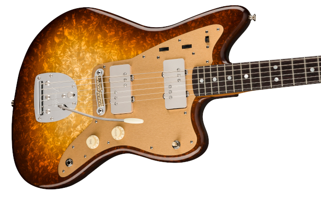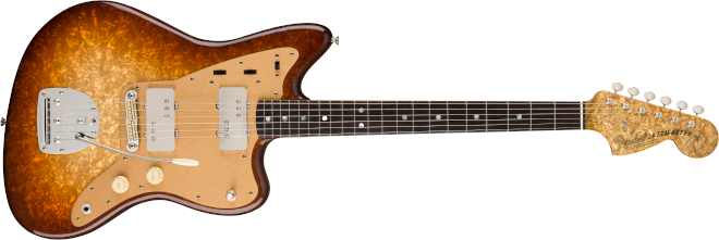 ヘッドの先からボディに至るまで、すべてパーロイドからのインスピレーションに満ちた作品。デニスが敬愛するFender Custom Shopの創設メンバーでもあるマスタービルダー、フレッド・スチュアートが得意とするパーロイド風の仕上げ(=Moto)を採用しており、彼との共作とも言える。仕様には、フレッドによる美しいMoto加工をまとった2ピースセレクトアッシュボディと’62 Jazzmaster (R)に見られるシェイプのローストクォーターソーンメイプルネックが挙げられる。ジェイ・ネルソンによる繊細なBronze Burst仕上げによって更なる優美さが磨き出された逸品。(希望小売価格 2,293,500円/税込)