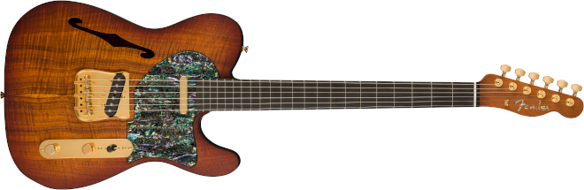 カイル・マクミリンが長年大切にしてきた、豪華なアバロンシェルピックガードに着想を得、シェル素材について徹底した検討を行い、マクミリンが求める完璧なコンビネーションにたどり着いた。アバロンシェルのピックガード、ヘッドストックにあしらわれたフェンダーロゴとサイドドットに至るまで、職人技が光る精緻な美しさが際立っている。本モデルはSatin Tobacco Burst仕上げに、ブラックのトップバインディングを持つタスマニアブラックウッド材を使用したシンラインボディが特徴。ホセフィーナ・カンポスによるHand-Wound Original Blackguardピックアップ(リア)とTwisted Tele(R)ピックアップ(フロント)を搭載したPrestige Thinline Telecaster(R)は、 ユニークでエレガントな外観を持ちながら、 伝統的なフェンダーサウンドを生み出す。(希望小売価格1,767,700円/税込)