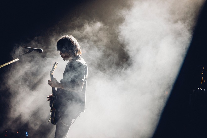 続く「Bloom in the Rain」も、生形のヘヴィなリフを軸に推進する楽曲。伸びやかなメロディとともにスピードを上げ続け、そこから「Spirit Inspiration」「白昼」という名リフ曲に繋いでいくセットリストがお見事。過去の楽曲では各パートがより複雑なフレージングで絡み合い、「Spirit Inspiration」での日向のスラップベースソロや、「白昼」で大喜多がスポットライトを浴びてアグレッシヴなプレイを見せた直後に生形がソロを奏でるなど、次々にハイライトシーンが訪れる。完全に攻撃モードだ。