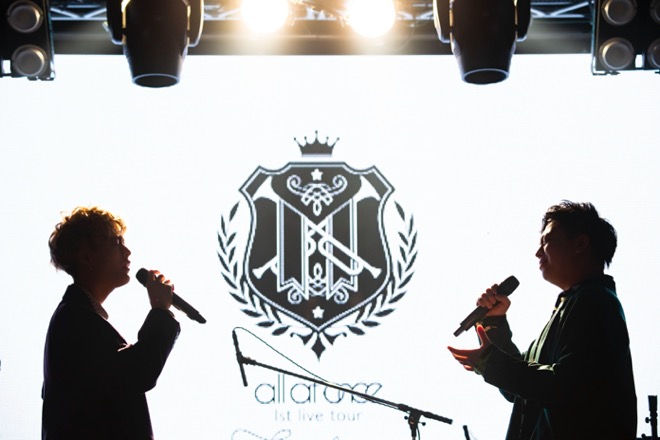 ITSUKIのみになったステージ上ではスタッフによる準備が進められ、「今回のライブのために2人で話し合って決めた」というスペシャルコーナーへ。まずはITSUKIがキーボード弾き語りでオフコースの「言葉にできない」をカバー。ファンへの気持ちを乗せて届けた。次にNARITOが大橋卓弥の「ありがとう」をギター弾き語りでカバー。音楽を志して上京した後に初めて母親に歌ったという思い出の曲だ。その後、キーボードITSUKI、ギターNARITOにバンドメンバーも入り、ORIGINAL LOVEの「接吻」をカバー。この曲はall at onceの始まりの楽曲だ。専門学校時代、課題のためにITSUKIがNARITOに偶然声をかけたことをきっかけに2人が初めて一緒に歌い、“この2人なら大きいステージにいける、一緒にやりたい”とITSUKIが確信したもの。この1stツアーで改めて披露されたことは、2人にもファンにとっても感慨深い時間になったはずだ。