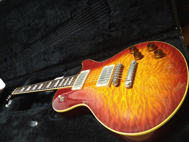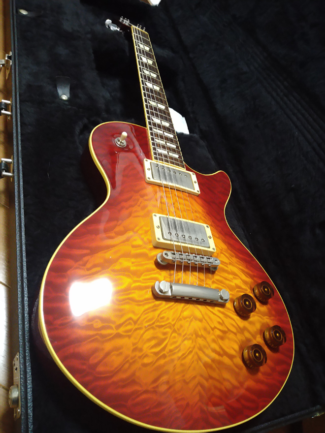 いったん死亡してからの蘇生とは思えない美しさ。ノブとトグルスイッチ部は凹み加工があるんですね。それにしても燃えるようなというか萌えるようなというか、うねりまくる杢が凄い。こんな極上キルトが水底で長年眠っていたなんてロマンっすね。そしてケースの中でまた死んで、んでもって奇跡の復活。波乱万丈なストーリーを宿したギターを愛でることで、rukiさんの人生もドラマチックで華やかなもの…なのかな。だってギターは生き物だもの。(JMN統括編集長 烏丸)