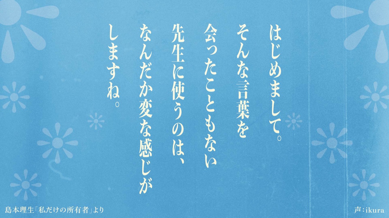 2月16日(水)に書籍『はじめての』発売と、島本理生「私だけの所有者」を原作とした楽曲「ミスター」のリリースで幕を開けた本プロジェクト。書籍『はじめての』にはそのほか、辻村深月「ユーレイ」、宮部みゆき「色違いのトランプ」、森絵都「ヒカリノタネ」も収録されている。