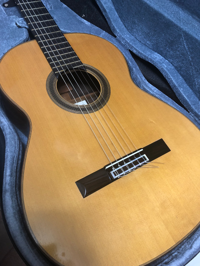 17年も前のこと、スペインの本物のクラシックギターを人生の最後の勝負と思い、清水の舞台から飛び降りる覚悟で手に入れました。いろいろなギターを何本も試奏し、新品ではとても無理なので中古で。