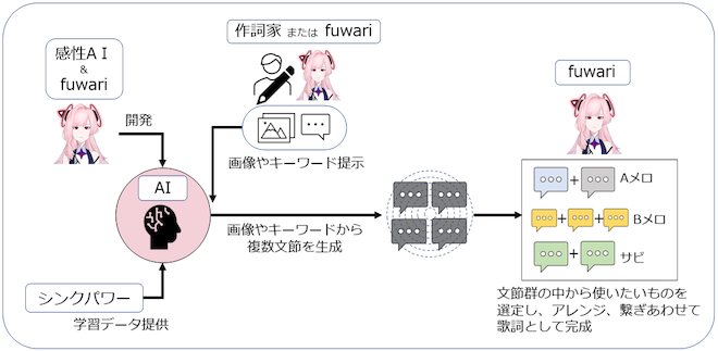 今回フィーチャリングしているfuwariは、AI作詞家VTuberという異例の肩書きの新人アーティスト。fuwariは、文章生成AIから生成された詩を歌詞へと発展させる形で作詞を行う。この文章生成AIは、キーワードや画像を提示するとその情報を基に文章を生成するもので、株式会社シンクパワーが学習データ協力を行い、感性A I株式会社の技術により作られたAIである。