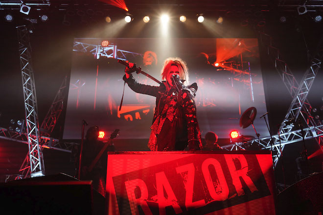 だからこそ、ストレートに暴走したときの爆発力は半端ない。衍龍の挑発的なギターリフで幕開けた「ブルータルモダン」で、「恐ろしい暴れっぷり見せて、この会場の客、全部持って帰ろうぜ!」とRAZORファンに呼びかけた猟牙は、ジャケットを脱ぎ捨てるなり、猛烈なデスヴォイスでフロアをヘッドバンギングの海に。重厚なヘヴィネスを正確に叩きだす楽器隊のプレイも痛快で、間奏では剣(G)が場内のクラップをアグレッシヴに誘う姿も見られた。「今日のイベントでいろんなものが解放されるようです。いろんなジャンル交わって、おもろいイベント共に創り上げましょう。素晴らしい声優、素晴らしいキャラクター、そして素晴らしいV系バンドRAZORです、よろしく!」と、贈られたラストソングは代表曲「千年ノ色彩」。