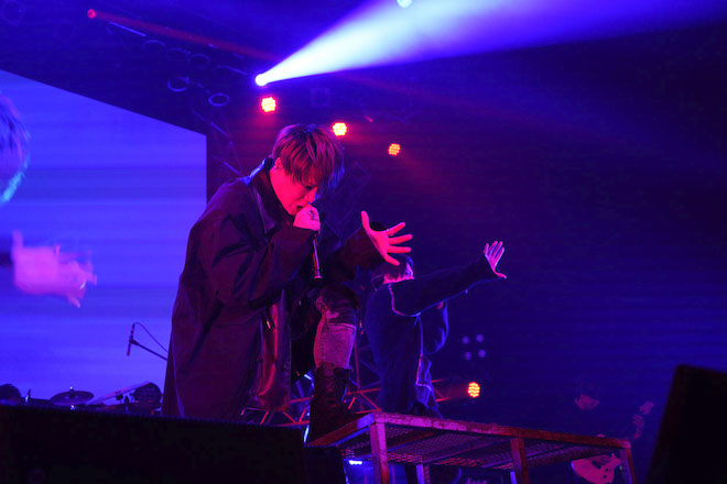 そんなネガティヴの中でも楽しむ術を持つのが彼らの強みで、青井ミドリ(B)がお立ち台でベースソロを鳴らし、「ただただみんなと楽しめる曲持ってきました! 手拍子ください!」(奏多)と「腐り姫」を投下すれば、オーディエンスは沸騰。「最後、解放して終わろうぜ! 溜まってるもん吐き出して!」と「死ねばいいのに。」がタイトルコールされると、客席は凄まじい勢いで頭を振り、「本当だったらみんなの声を聴きたいけど、俺らが代わりに叫んでやるから、心の中で“死んじまえ!”って叫んでくれ!」という奏多の言葉に、嬉々として飛び跳ねる。わずか4曲ながら、独特の世界観を存分に見せつけた。