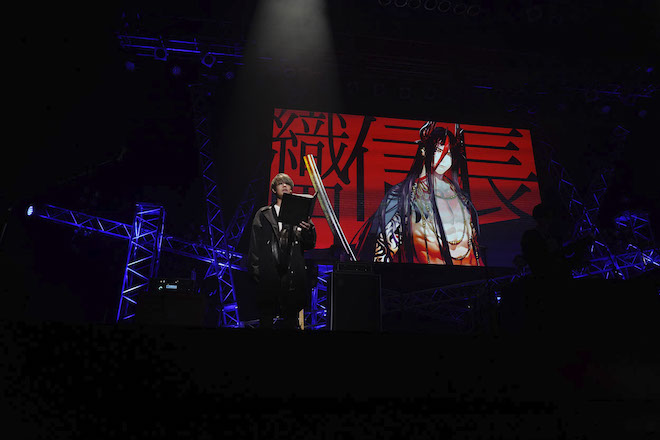 宴も佳境に差し掛かり、朗読劇ではNNこと織田信長が参上。秀吉が逃げ帰り家康が怯えるのをよそに、“コラボ楽曲決定! 第六天魔王軍×RAZOR”と浮かんだところで、デジタリックなSEからシームレスでRAZORのライヴに突入する。