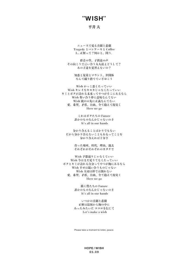 平井 大、“今への願い”が詰まった未発表曲「WISH」リリックビデオ公開。新聞で歌詞も公開