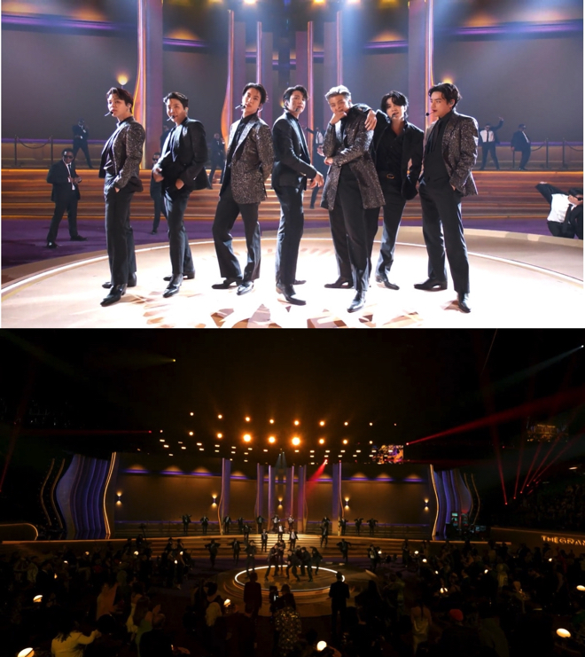 今回の授賞式では「Butter」の《Smooth like Butter, like a criminal undercover / Gon’ pop like trouble breaking into your heart like that(バターのようになめらかに 正体を隠した悪党のように 急なトラブルのように弾けて 君の心の中にこっそり入っていくよ)》という歌詞のように“いきなり襲い掛かる7人のメンバーが「グラミー授賞式」でたくさんの観客の心を奪う”というコンセプトで、スパイアクション映画風のステージを展開。管制センターから指令を下すJIN、空中からメインステージに降りてくるJUNG KOOKに続いてJ-HOPE、JIMIN、RM、SUGA、Vも登場し、カードを使った振付やレーザーをくぐり抜ける“レーザーパフォーマンス”、ジャケットを活用したダンスブレイクなどを盛り込んだ華やかなライブパフォーマンスを届けた。
