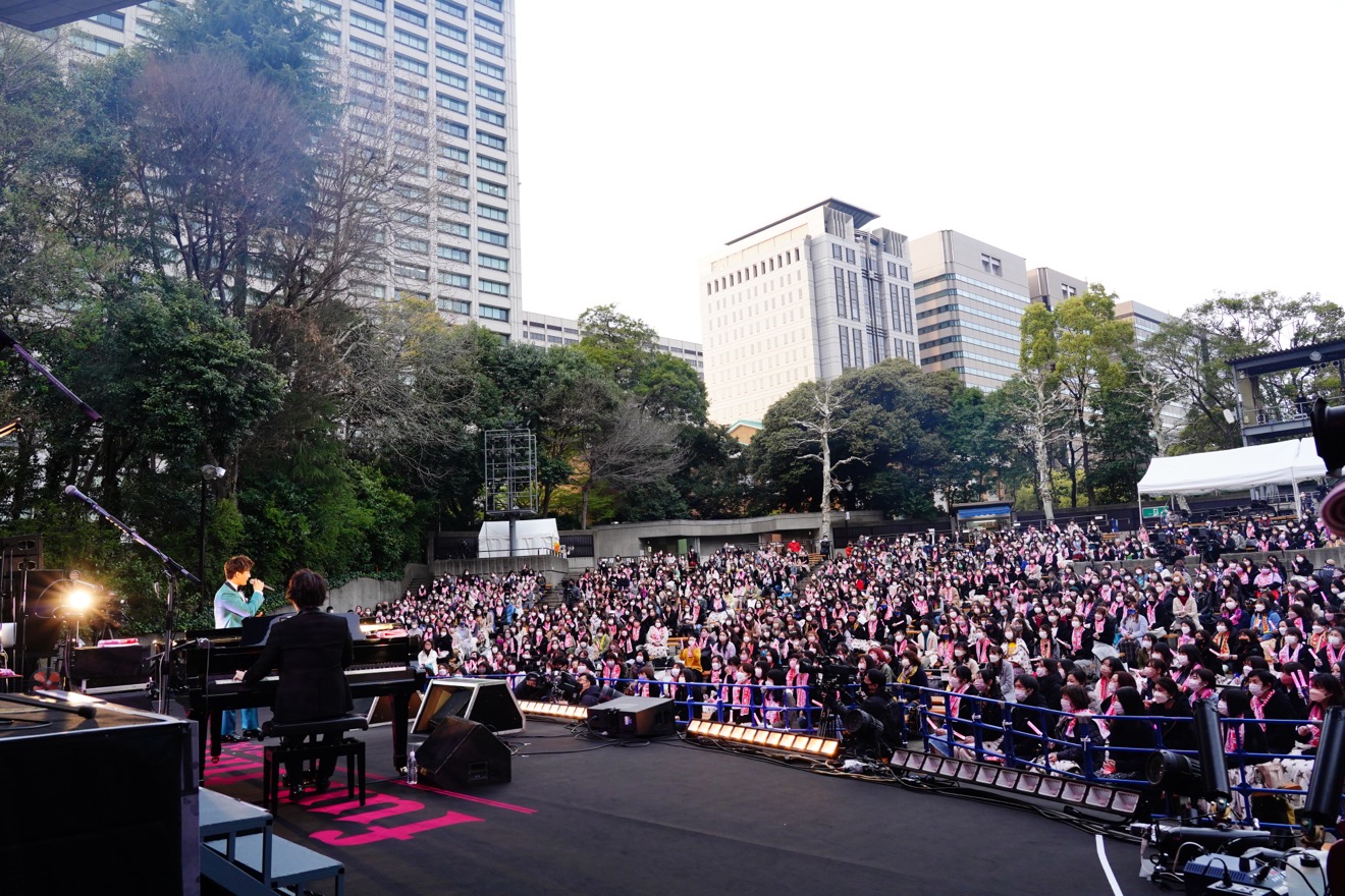 夕刻、花冷えの日比谷野外音楽堂。グランドピアノが鎮座するステージにまず現れたのは、黒いスーツにリボンタイという装いの吹野クワガタ(Pf)だ。客席に向かって静かに一礼し、この日のために書き下ろしたという「祈り」を演奏。神聖な空気に包まれたところで、ステージ後方の高い位置から加藤和樹が現れた。ミュージカルの一場面を想起させるようなストーリー性のある演出で歌われた1曲目は「あなたと出会えて僕は幸せでした」。天にまで想いを馳せるように、全ての出会いに感謝をするように、桜咲く季節の思いを綴ったこの曲を大切に歌い上げた。