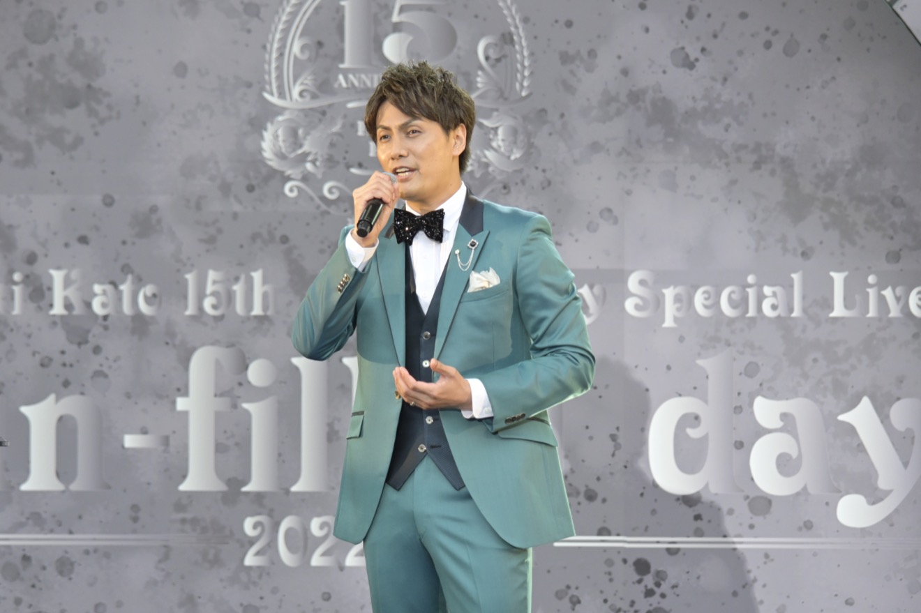 「ここからは<15周年怒涛のメドレー>になります。ラストまで一気に駆け抜けます。デビューからいろんな楽曲を歌わせていただきましたが、このメドレーは僕のデビュー前、僕の歌人生はここから始まったというこの曲からスタートしたいと思います!」