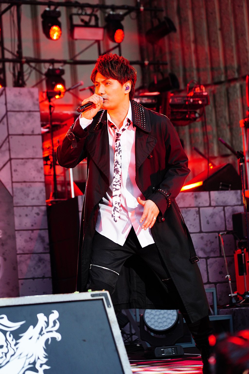 ミュージカル『テニスの王子様』で加藤が演じた跡部景吾の「Flaming ice」から始まったこのコーナー。全13曲が年代順に披露されたのだが、いわゆるメドレーとして印象的な部分だけを歌い繋ぐものではなく、かなりしっかりと1曲1曲の世界観を打ち出しながら届けられていたように思う。「BEACH」や「Ultra Worker」ではみんなでタオルを回し、「灼熱フィンガーでFEVER!」はDORA(G)とのパフォーマンスで盛り上げる。「HERO」では高低差を利用して組まれているセットの上段にまで行って歌ったりするなど、選曲としてはもちろん、視覚的にも楽しませる要素が詰め込まれていた。時間にして約20分。これだけでもずいぶんなボリュームなのに、ひと息つく間も無く歌い始めたのが「Vampire」、そのまま「Blue Monday」と続いた流れに驚いたファンも多かったのではないだろうか。「Blue Monday」ではDORA(G)、五十嵐勝人(G)、川渕文雄(Ba)も降りてきて、ステージ最前で4人が客席を煽るシーンも。声は出せないが、カラフルに輝くサイリウムでオーディエンスも全力のリアクションだ。ラストは、今この社会の中でもがきながらも覚悟を決めて生きていくんだというメッセージを込めた「Answer」。この時点で2時間以上歌い続けているとは思えないパワフルな歌声が、野音の夜空へと響き渡っていた。