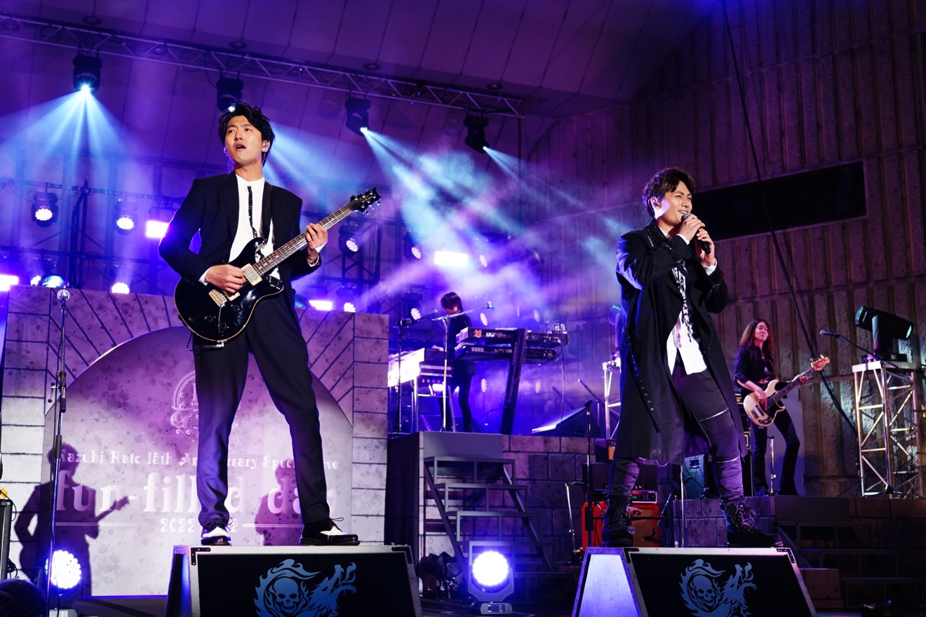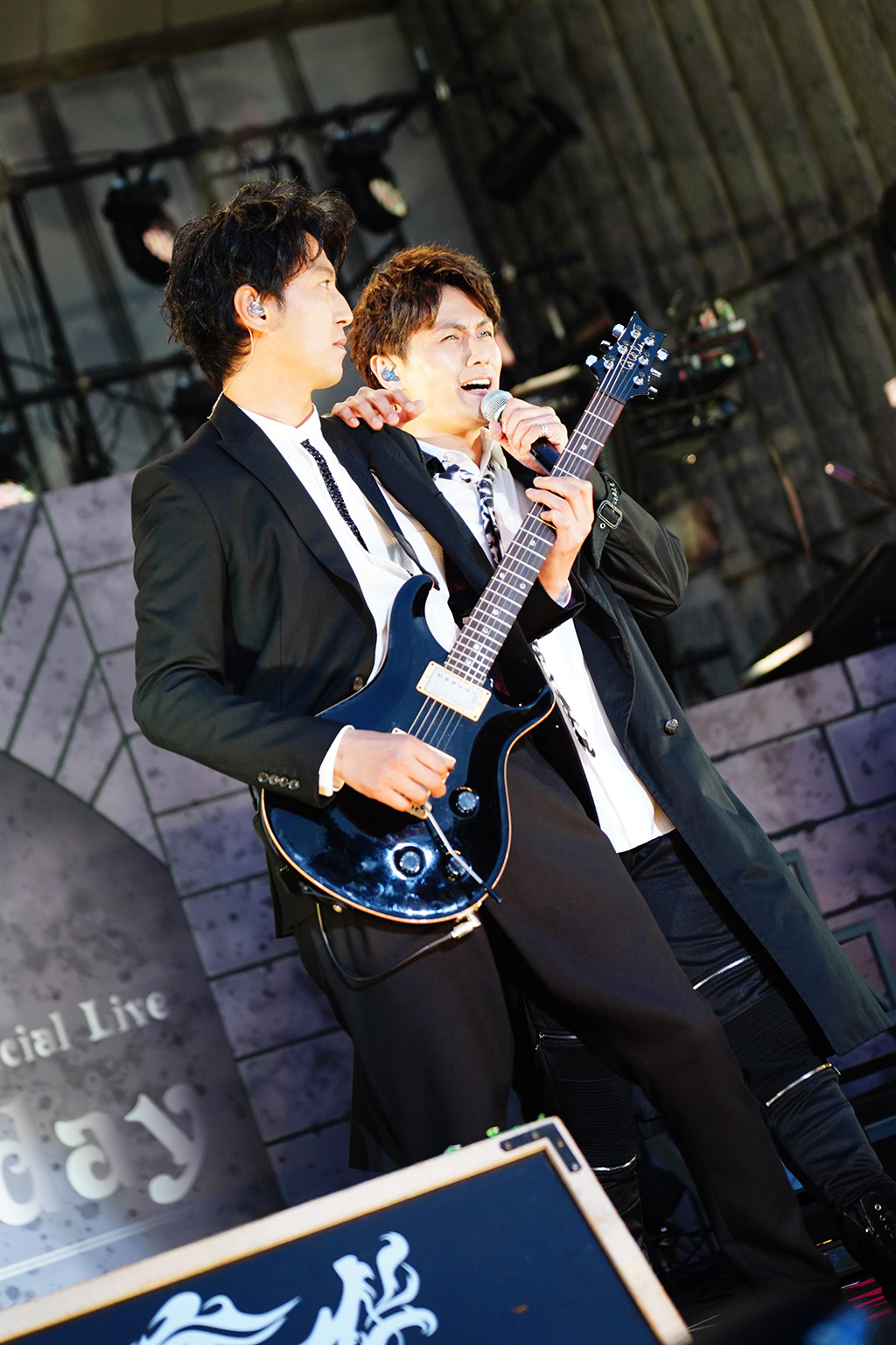 第2部となるステージは、加藤和樹と伊達孝時によるユニットJOKER。約9年ぶりの復活となったこの日、立ち込めるスモークと真っ赤な照明に煽られながら現れた2人の姿に、会場からは熱狂的な拍手が寄せられる。「お前ら、準備はいいか!」という加藤の声を合図に、JOKERのデビュー曲「No.1」からスタート。当時と同じサポートメンバー(吉田トオル(Key)/五十嵐勝人(Gt)/満園庄太郎(Ba)/今村舞(Dr))が集まったのは、決して”当時”を再現するためではなく、このメンバーじゃないと出せないグルーヴ感やメンバーの個性そのものが楽曲にも反映されているからなのだろう。