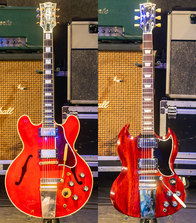 ▲メインギター(写真左)はギブソンと生形が共同開発したシグネチュアモデル。基本仕様はギブソンES-355と共通しているがクロームのハードウェア類やダイヤモンドfホール、バリトーンスイッチ、ブラックピックガードなどが採用されていることが特徴だ。