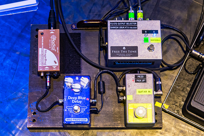 ▲メインボード左側のサブボードはピエゾピックアップ用スイッチとDI、アンプセレクターをセット。写真右上から時計回りに、Free The ToneのアウトプットセレクターFC-370 Output Selector、ピエゾとマグネットピックアップ切り替え用アウトプットセレクター、Mad ProfessorのディレイDeep Blue Delay、RadialのダイレクトボックスJ48。