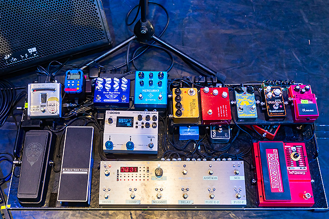 ▲数々のコンパクトエフェクターはFree The ToneのプログラマブルスイッチャーARC-3でコントロール。写真上段右から、 BOSSのアナログディレイDM-2W、SubdecayのフェイザーQuasar Quantum、Diaz PedalsのトレモロTexas Tremodillo、KLONのオーバードライブKTR、Human GearのファズANIMATO FORTE。それらが載った台の下は右から、Free The ToneのオーバードライブRED JASPER RJ-2V、Bognerのブースター/コンプレッサーHARLOW RUPERT NEVE DESIGNS BOOST With BLOOM、Wren and CuffのファズYour Face 60’s Hot Germanium Fuzz、その裏側にはZ.VexのファズFuzz Factoryもセット。