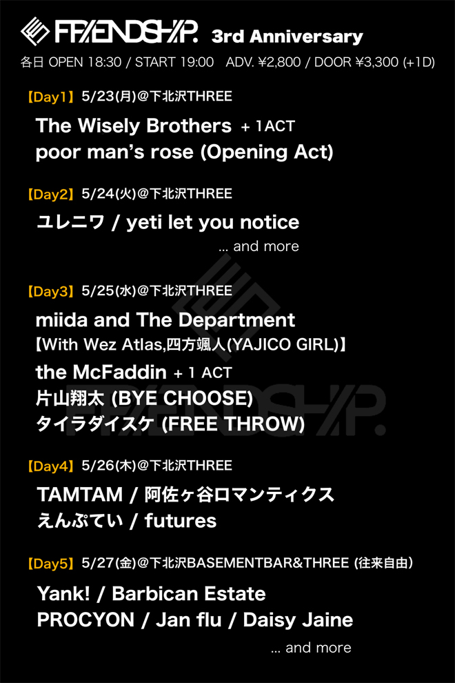 会場の下北沢THREEは、FRIENDSHIP.のキュレーターでもある片山翔太がブッキングスタッフとして在籍するライブハウスで、最終日のみ同系列のライブハウスであるBASEMENT BARとの2会場往来自由のイベントとして開催される。今回発表された出演アーティストはThe Wisely Brothers、poor man’s rose、ユレニワ、yeti let you notice、miida and The Department (with Wez Atlas、四方颯人 from YAJICO GIRL)、the McFaddin、TAMTAM、阿佐ヶ谷ロマンティクス、えんぷてい、futures、Yank!、Barbican Estate、PROCYON、Jan flu、Daisy Jaineの全15組。なお、4月6日(水)10:00よりイープラスと下北沢THREEのサイトにてチケット販売がスタートする。