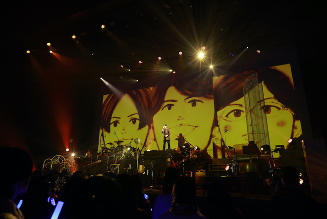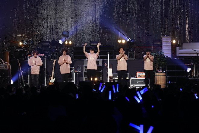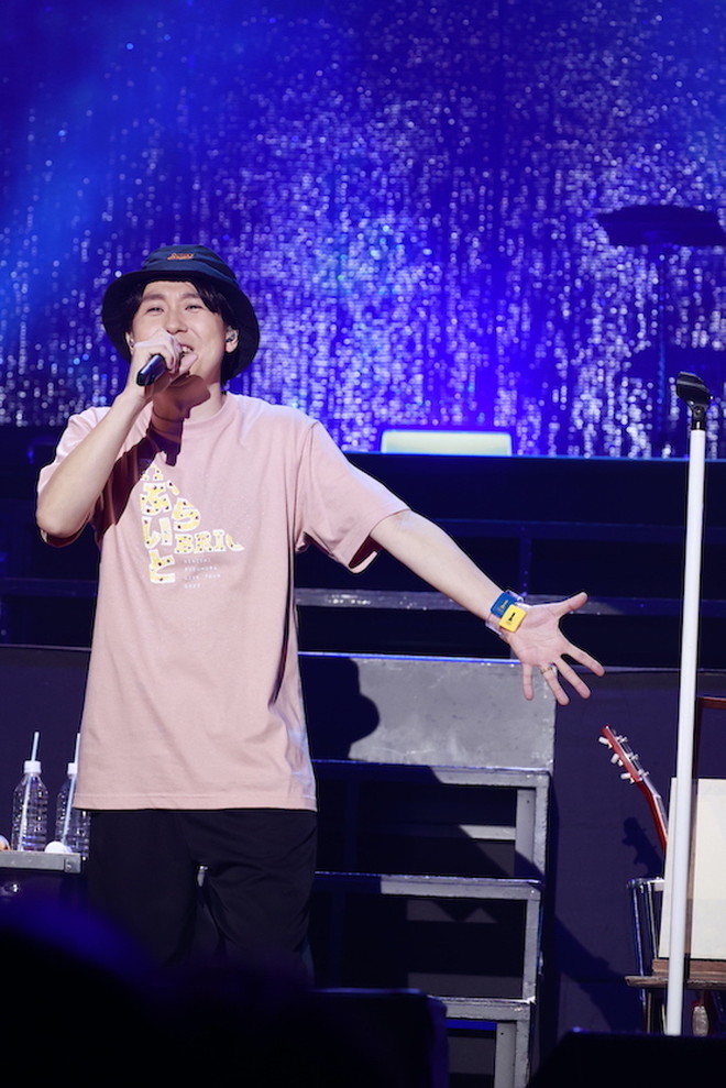 ひとり布団の中で塞ぎ込んでいた男が、ネットを通じて人々と繋がる姿を描いたサンドアートに続いて歌われた「リズム」は、クラップでコール&レスポンス。コロナ禍で仲間達とリモート制作されたこの曲をオーディエンスと体現。離れていても独りじゃないと歌う「月のうた」、誰かを照らすことが自分を強くすると歌う「太陽のうた」はスケールの大きな感動を呼び、サンバホイッスルが鳴り響く「My Life Summer Life」のラテンのリズムが一気にステージに明るい光を差し込ませる。