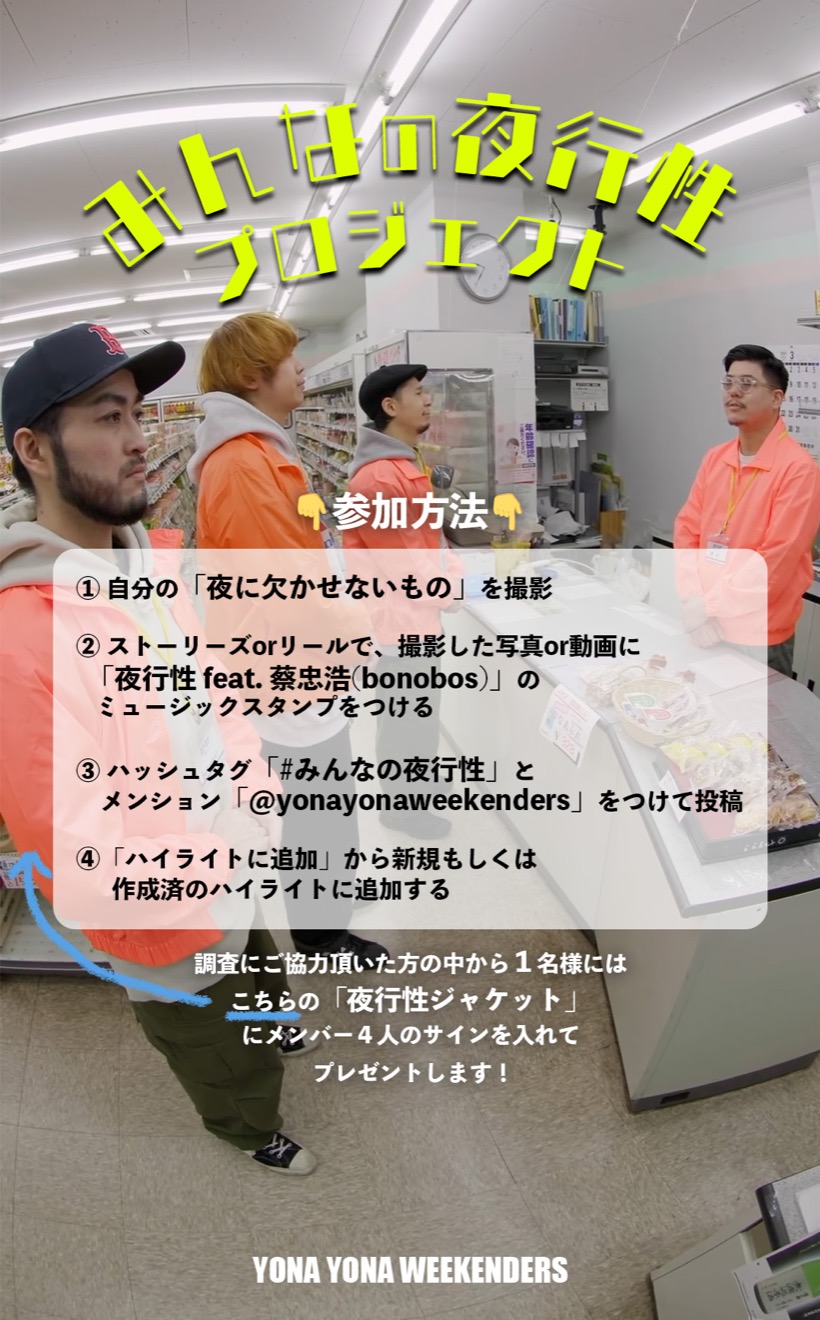 あなたの「夜に欠かせないもの」を撮影し、「夜行性 feat. 蔡忠浩(bonobos)」のミュージックスタンプと「#みんなの夜行性」「@yonayonaweekenders」をつけて投稿してください。