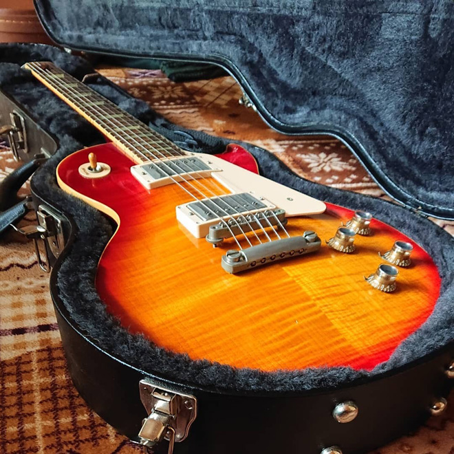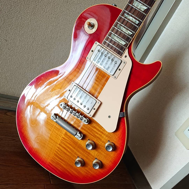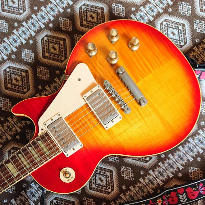 前々回(656)に掲載して頂きましたLES PAUL CLASSICの兄貴分となるギターです。ド柾目の木目にイイカンジに虎杢が出てると思います。前々回のCLASSICよりも赤みが強いです。2018年に購入してトラスロッドカバー、エスカッション、ピックガード、コントロールノブを交換して、ニッケルのピックアップカバーを着けました。前回(659)の緑のCLASSICにもカバー着けましたね(笑)この時代(ヒスコレ誕生前後)のCLASSICは狙い目ですね。見栄えは悪くないと思います。ピックアップ(フロント:496R&リア:500T)はセラミックでパワーがあるんでカバー付けて丁度良い感じがします。まだまだ欲しいギターはありますが、キリがないですね(笑)