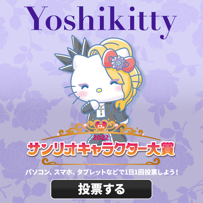 また、 ハローキティデザイナーの山口裕子氏も出演し、本日4月8日4里スタートした『2022年サンリオキャラクター大賞』でyoshikittyが1位になったあかつきには、山口氏がサンリオピューロランドに大きな木のアトラクションを作ることや、YOSHIKIがアルバム発売を含めたファンからの様々な要望に応えることなど多くの公約が掲げられた。さらにyoshikittyの新商品プレゼント企画も告知された。