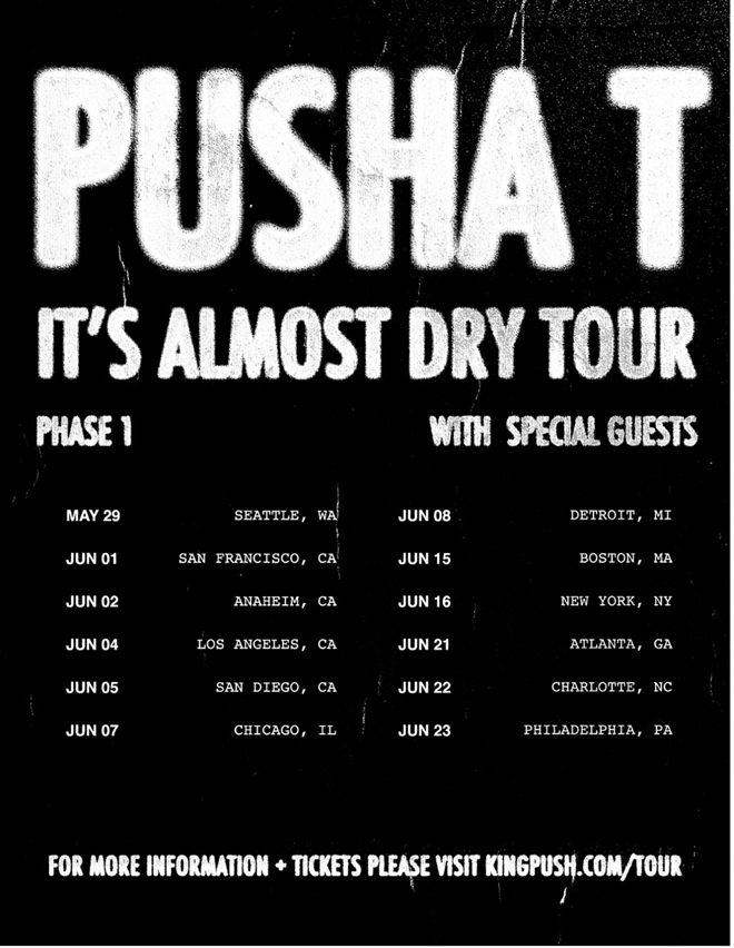 またプッシャ・Tは、新曲のリリースに合わせて<It’s Almost Dry Tour>の開催を発表。米・ワシントン州シアトルでスタートするこのツアーは、1ヶ月間で12公演行われる予定だ。
