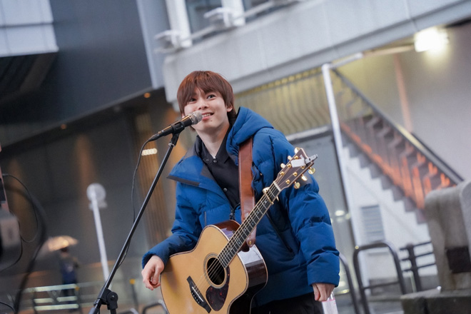 定刻の10分ほど前になると、広場の歩道橋下に設えたステージに岸がふらりと登場。この日は雨模様で、加えて気温もかなり低いという野外ライブにはあいにくのコンディション。岸は「みなさん、無理しないでくださいね」と、雨の中、傘を差しながら彼を待っていた観客を気遣いつつ、サウンドチェックへ。アコースティックギターを爪弾きながら、一青窈の「ハナミズキ」をリラックスした面持ちで歌い上げていく。その伸びやかな歌声は、本番への期待感を高めるに十分なものだった。「手がかじかむ(笑)」と観客に語りかけたりしながら、開演時間になるのを待っていたが、寒い中で観客を待たせているのも忍びなかったのだろう、「もう始めましょうか」とフライング気味にライブをスタートさせた。